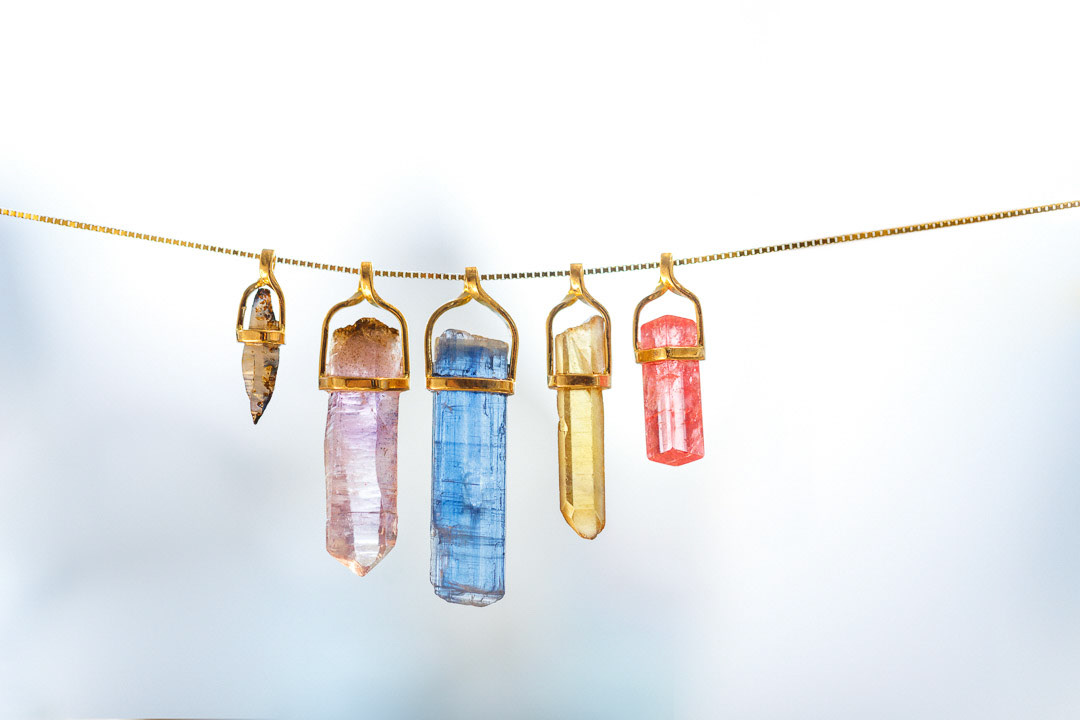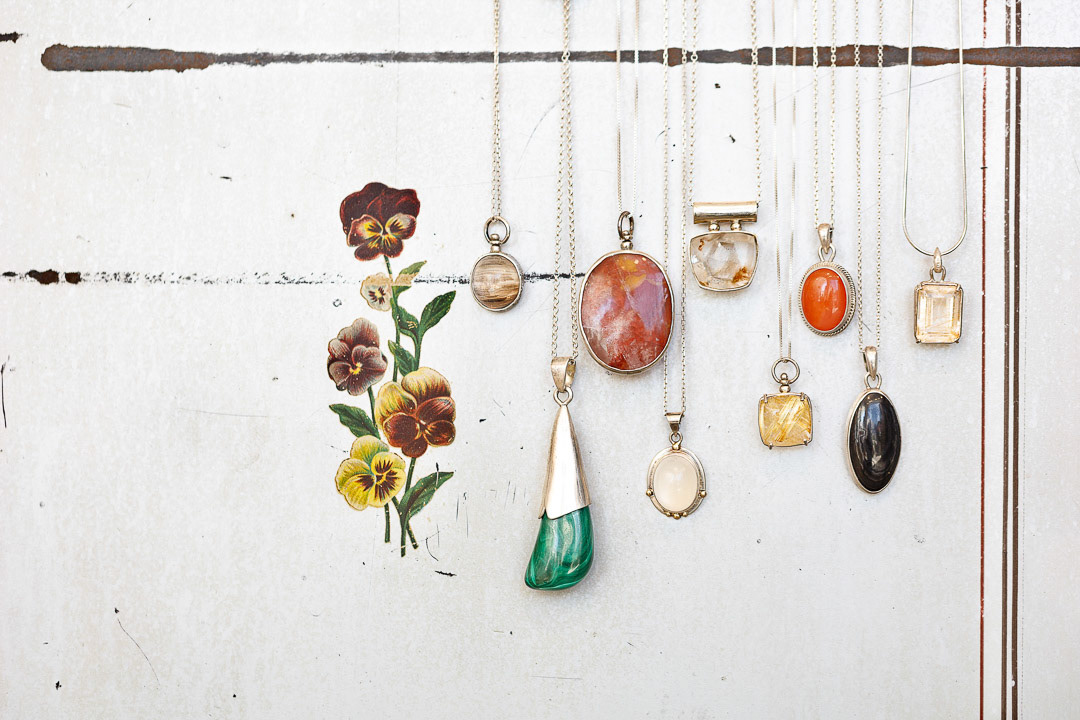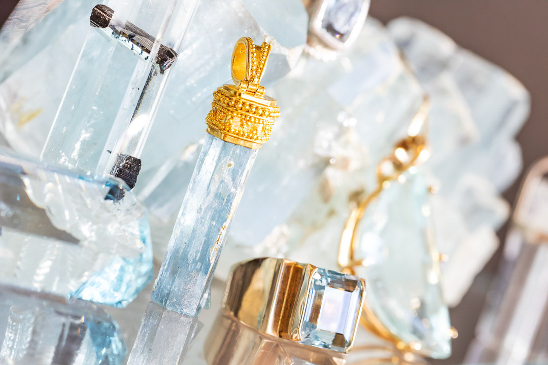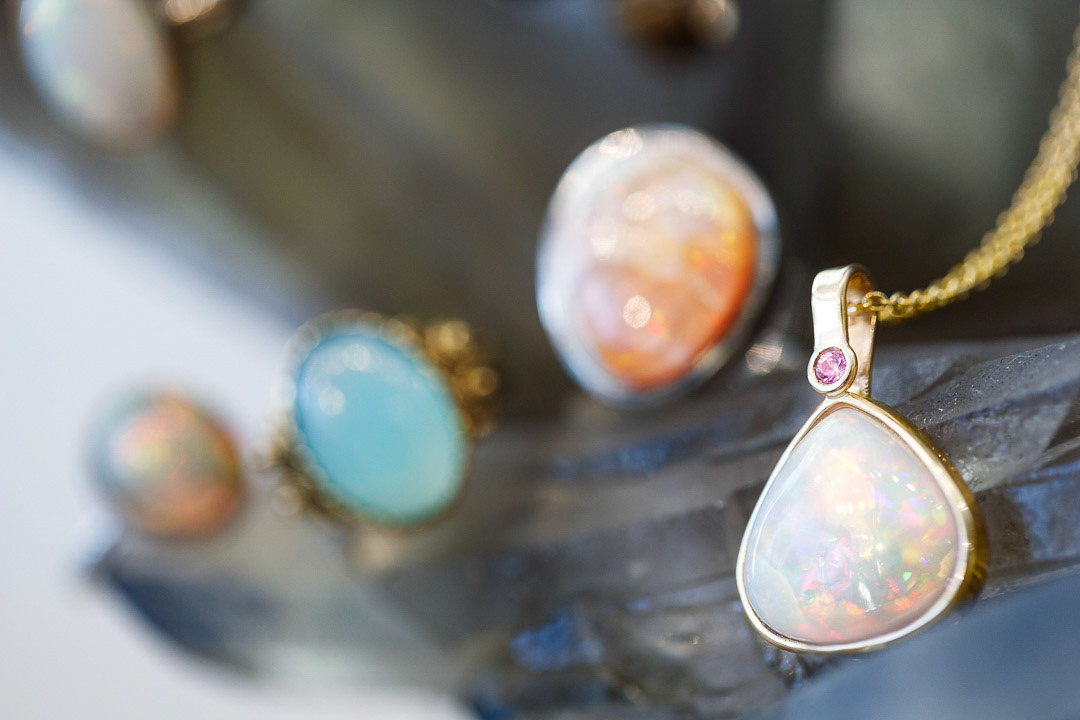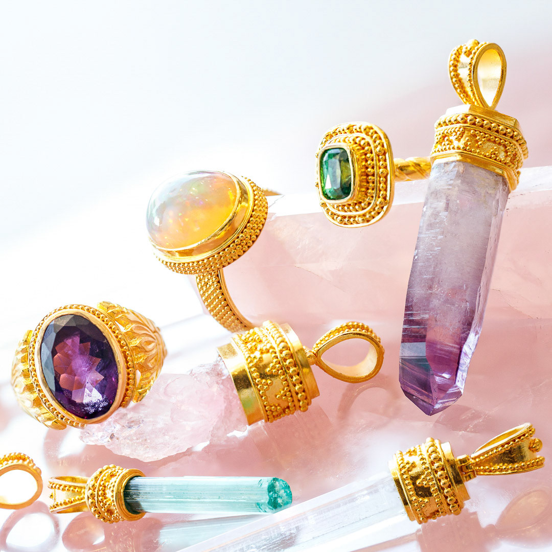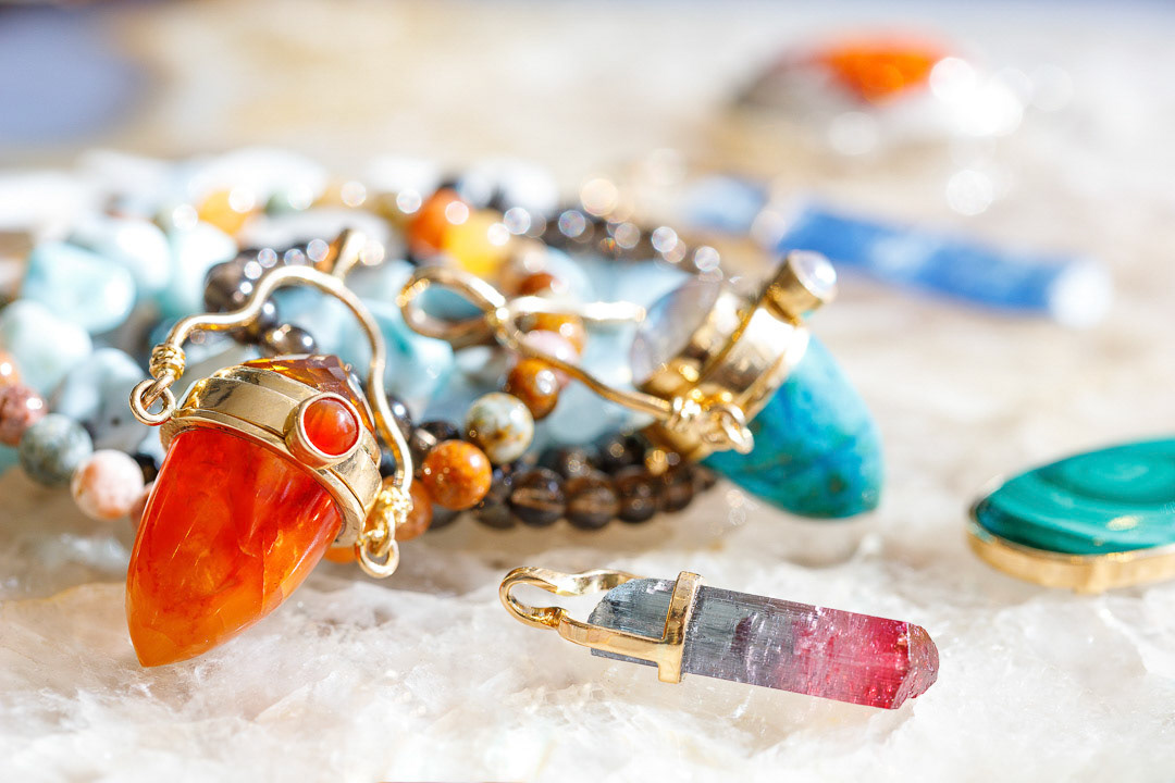 Lifestyle and product photography of an assortment of fine jewelry and mineral specimens
